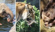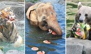 말복(10일)을 앞둔 6일 경기 과천시 서울대공원에서 시베리아호랑이(왼쪽 사진)가 생닭을 먹고 있다. 아시아 코끼리(가운데 사진)는 수박을, 유럽 불곰(오른쪽 사진)은 얼린 과일을 먹었다. 서울대공원은 폭염에 지쳐 입맛이 떨어진 동물들의 더위 스트레스 극복과 영양 공급을 위해 특식을 제공하고 있다. 양회성 기자 yohan@donga.com·서울대공원 제공}