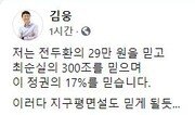 김웅 국민의힘 의원은 24일 문재인 정부의 아파트값 상승률과 관련 “이 정권의 17%를 믿습니다”라고 말했다.그는 페이스북에 “정부, 17% 오른 아파트 한곳이라도 찍어봐라”는 경실련 측의 비판을 기사로 링크하면서 이같이 비꼬았다.그러면서 “저는 전두환의 29만 원을 믿고 최순실의 300조를 믿는다. 이러다 지구평면설도 믿게 될듯”이라고 덧붙였다.전날 경제정의실천시민연합(경실련)은 기자회견에서 “서울 75개 단지 아파트 11만5000가구의 시세 변동을 분석한 결과, 지난 4년 동안 서울의 아파트 값은 93% 상승했다”며 “약 3년 반 동안 서울 아파트 값이 17% 올랐다는 정부의 발표는 현실을 왜곡한 거짓 통계”라고 비판했다.박태근 동아닷컴 기자 ptk@donga.com}