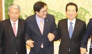 국민의당 김동철, 더불어민주당 우원식 원내대표, 정세균 국회의장, 자유한국당 김성태 원내대표(왼쪽부터)가 8일 국회에서 열린 3당 원내대표 정례회동에 앞서 손을 맞잡고 있다. 여야는 국회 헌법개정·정치개혁 특별위원회와 사법개혁 특별위원회 구성을 조속히 마치고, 이번 주에 첫 전체회의를 열기로 했다. 김동주 기자 zoo@donga.com}