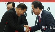 12일 자유한국당 당사에서 입당식을 한 늘푸른한국당 이재오 대표(왼쪽)가 한국당 홍준표 대표와 악수하고 있다. 2017년 1월 친이계 세력 중심으로 창당했던 늘푸른한국당은 1년여 만에 당을 해체하고 한국당에 입당하기로 했다. 김동주 기자 zoo@donga.com}