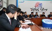 7일 오전 국회 본청 더불어민주당 당 대표 회의실. 회의장 안은 여느 때처럼 취재 기자로 발디딜 틈 없을 정도로 복잡했다. 회의 참석자들의 표정에는 왠지 모를 낭패감과 곤혹감이 감돌았다. 안희정 계로 분류되지는 않지만 충청 지역 최고위원인 박완주 의원은 회의 내내 고개를 들지 못했다. 그는 “국민께 머리 숙여 사과드린다”는 말을 하기도 했다. 안희정 전 충남도지사의 성폭행 사건으로 공황 상태에 빠져 6일 당 지도부 회의까지 취소했던 더불어민주당. 당 지도부는 코 앞으로 닥친 6.13 지방선거를 위해 안희정 후폭풍에서 빨리 벗어나려고 노력하고 있다. 하지만 이는 쉽지 않아보인다. 안희정 후폭풍과 직접적 관계가 없는 비(非) 안희정 계 의원이나 충청 이외 지역 의원들도 동요하고 있다. 한 마디로 더불어민주당 전체가 ‘멘붕’에 빠진 듯하다. 이날 회의에 참석하진 않았지만 안희정 후폭풍의 직격탄을 맞은 이들은 지난해 더불어민주당 대통령 후보 경선 당시 안희정 캠프에 몸 담았던 의원들이다. 자타가 공인하는 ‘안희정의 친구’ 박수현 전 청와대 대변인은 이미 충남지사 선거 운동을 중단했다. 당시 멘토 단장을 맡았던 박영선 의원도 사정은 마찬가지. 그는 평창올림픽 특혜 응원 악재가 가라앉기도 전에 안희정 악재까지 겹쳐 서울시장 경선 가도에 큰 장애물을 만났다. 추미애 대표와 우원식 원내대표 등 당 지도부는 방북 성과를 적극 부각해 안희정 악재를 돌파하려 한다. 6일 청와대 측이 “방북 성과가 안희정 폭로로 묻혔다. 언론이 방북 성과에 관심을 가져주지 않는다”는 취지로 불만을 표시한 것도 이와 무관치 않다. 추미애 대표는 모두 발언에서 “안 전 지사 건으로 자칫 묻힐 뻔했지만 다행히 성과가 너무나 꽉 차고 크기에 마음을 가다듬기로 했다”며 “4월 말 남북 정상회담 및 추가 핵실험 중지 약속 등으로 한반도 전체가 평화로 가는 획기적 돌파구를 만들었다”고 말했다. 김동주 기자 zoo@donga.com}