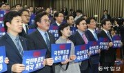 9일 오후 국회에서 열린 더불어민주당 의원총회에서 추미애 대표(왼쪽에서 세 번째) 등이 국민투표법 개정을 촉구하고 있다. 김동주 기자 zoo@donga.com}