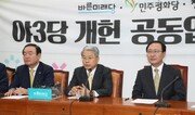 12일 오전 8시 국회 본청 바른미래당 회의실에 야3당(바른미래당,민주평화당,정의당)원내대표와 헌정특위 간사들이 모였다. 바른미래당 김동철원내대표,김관영 헌정특위간사,민주평화당 장병완원내대표,김광수 헌정특위간사,정의당 노회찬원내대표,심상정 헌정특위간사등 총 6명이다. 각 당 원내대표의 간단한 인사말이후에 바른미래당 김관영 간사, 정의당 심상정 간사, 민주평화당 김광수 헌정특위간사 순으로 개헌과 선거제도 개혁의 성사를 위한 바른미래당·민주평화당·정의당 공동합의 입장문을 읽어내려 갔다. 이들은 입장문에서 ▲민주당은 대통령 개헌안에 대한 찬반을 강요하는 것이 아니라 분권과 협치를 실현할 정부 형태 타협안을 내놓고 ▲한국당은 ‘국민 대표성 강화’라는 추상적 문구를 넘어 연동형 비례대표제 도입 등 구체적 대안을 명시적으로 밝히며 ▲거대 양당의 타협안을 통해 원내대표와 헌정특위 간사가 참여하는 ‘정치협상회의’를 정식으로 가동하자고 주장했다.사진·동영상·글=김동주 기자 zoo@donga.com}