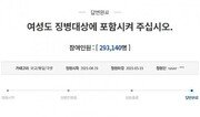 청와대가 ‘여성징병제 도입’을 검토해달라는 국민 청원에 “신중하게 결정해야 하는 사안”이라고 답했다.청와대는 18일 약 29만 명의 동의를 얻은 해당 청원에 대해 답변자를 지정하지 않고 디지털소통센터 명의로 답변했다.청와대는 “병역제도 개편 논의는 국가 안보의 핵심 사항”이라며 “따라서 ‘한반도 안보상황을 고려한 상비병력 충원 가능성’과 ‘군사적 효용성’ 등을 기준으로 판단해야 한다”고 설명했다.이어 “특히 여성 징병제는 병력의 소요충원에 국한된 문제가 아니라, 다양한 쟁점을 포함하고 있어 국민적 공감대와 사회적 합의 등 충분한 공론화를 거쳐 신중하게 결정해야 하는 사안”이라며 “여성 징병이 실제로 구현되려면 군복무 환경, 성평등한 군 조직문화 개선 등에 대한 종합적인 연구와 사전 준비가 충분히 이루어져야 할 것”이라고 강조했다.앞서 지난달 19일 국민청원 게시판에는 ‘여성도 징병대상에 포함시켜 주십시오’라는 제목의 청원이 올라왔다.청원인은 “나날이 줄어드는 출산율과 함께 우리 군은 병력 보충에 큰 차질을 겪고 있다”며 “이에 따라 남성의 징집률 또한 9할에 육박하고 있다”고 운을 뗐다.이어 “과거에 비해서 높아진 징집률 만큼이나 군복무에 적절치 못한 인원들 마저 억지로 징병대상이 되어 버리기 때문에 국군의 전체적인 질적 악화가 우려되는 상황”이라며 “이에 대한 대책으로 여성 또한 징집 대상에 포함하여 더욱 효율적인 병구성을 해야한다”고 주장했다. 그는 “여성들도 이에 대해 인지를 하고 있으며 많은 커뮤니티를 지켜본 결과 과반수의 여성들도 여성에 대한 징병을 긍정적으로 바라보고 있음을 확인했다”며 “여성의 능력이 결코 남성에 비해 떨어지지 않음을 모두가 인지하고 있는 현대사회에서 병역의 의무를 남성에게만 지게 하는 것은 매우 후진적이고 여성비하적인 발상”이라고 했다.김혜린 동아닷컴 기자 sinnala8@donga.com}