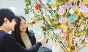 영남이공대 학생들이 10일 대학 중앙도서관 1층에 마련된 버킷리스트 트리에 매달린 글을 보고 있다. 버킷리스트는 죽기 전에 꼭 하고 싶은 일과 보고 싶은 것들을 적은 목록이다. 대학 측은 연말까지 이 트리를 전시할 예정이다. 영남이공대 제공}