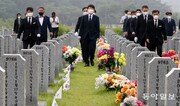 이준석 국민의힘 신임 당대표의 첫 공식일정은 대전 현충원에 안장된 천안함 46용사 묘역 참배였다. 통상 여야를 막론하고 신임 당 대표들은 국립서울현충원 참배를 공식일정으로 하지만 이 대표는 국립대전현충원을 찾았다. 오전 7시 30분 첫 일정으로 대전현충원 현충탑을 참배했다. 이후 천안함 46용사 묘역과 제2연평해전·연평도 포격도발, 마린온 순직 장병 묘역을 차례로 찾았다. 이대표는 현충원 방명록에 “내일을 준비하는 대한민국은 숭고한 희생과 헌신을 잊지 않겠습니다”라고 적었다. 이 대표는 천안함 전사자 묘역을 참배한 뒤 유가족을 만나며 눈물을 보이기도 했다. 이 자리에서 유가족은 “(고등학생) 아들이 상처를 좀 많이 받았다. 이 대표가 하신 말씀을 보고 아들이 그 마음 변치 않았으면 좋겠다고 꼭 말해달라고 했다”며 눈물을 훔쳤다. 대전현충원 방문을 마친 이 대표는 바로 광주 붕괴사고 희생자들을 기리기 위해 광주를 방문했다. 합동분향소를 찾은 이 대표는 조문을 한 뒤 “수사력을 총동원해 사건의 책임자를 가려주었으면 한다”고 전했다. 이후 오후에는 국회에서 열린 국민의힘 최고위원회의에 참석해 첫 회의를 주재했다. 이준석 국민의힘 신임 당 대표는 첫 날 행보로 약 700km 가량을 종횡무진 했다.김재명 기자base@donga.com}