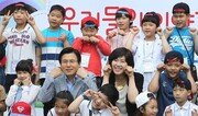 황교안 대통령 권한대행(가운데)과 부인 최지영 씨가 5일 어린이날을 맞아 서울 종로구 총리공관에서 초등학생 초청 행사를 열고 어린이들과 사진을 찍고 있다. 변영욱 기자 cut@donga.com}