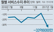 올해 1월 서비스수지가 사상 최대 적자를 냈다. 설 연휴를 맞아 해외여행이 크게 늘어난 데다 해운업 불황, 해외 건설 부진 등의 악재가 맞물린 결과다. 3일 한국은행에 따르면 1월 서비스수지는 33억6000만 달러 적자로 월간 기준으로 사상 최대 적자를 나타냈다. 지난해 12월 적자 규모(7억9000만 달러)의 4배를 웃도는 수준이다. 직전 최대 적자였던 2012년 12월(26억5000만 달러)에 비해서도 27% 늘었다. 우선 만성 적자인 여행수지(―12억2000만 달러)가 적자 폭을 더 키웠다. 설 연휴와 겨울방학을 맞아 1월 해외 출국자가 사상 최대를 나타내는 등 한국인의 해외여행이 늘었기 때문이다. 여기에다 중국인 관광객의 씀씀이가 줄어든 것도 영향을 미쳤다. 향후 중국의 사드(THAAD·고고도미사일방어체계) 배치 보복으로 한국을 찾는 중국 여행객이 급감할 경우 여행수지 적자가 더 확대될 것이라는 우려가 나온다. 해운업 불황과 한진해운 파산의 여파로 지난해부터 적자로 돌아선 운송수지(―2억3000만 달러) 또한 적자 폭이 커졌다. 해외 건설 ‘수주 절벽’으로 건설수지 흑자(4억2000만 달러)는 10년 만에 최저치로 쪼그라들었다. 상품 수출보다 수입이 늘면서 상품수지 흑자는 5개월 만에 가장 적은 78억1000만 달러를 나타냈다. 상품수지와 서비스수지 등을 모두 더한 경상수지(52억8000만 달러)는 사상 최장인 59개월 연속 흑자를 이어갔지만 흑자 규모는 지난해 8월 이후 가장 작았다.정임수 기자 imsoo@donga.com}