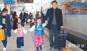 설 연휴를 하루 앞둔 14일 한복을 곱게 차려입은 아이들이 열차를 타기 위해 아빠 엄마의 손을 잡고 서울역 승강장을 걸어가고 있다. 한국철도공사에 따르면 이날 약 7만5000명이 기차를 타고 서울을 떠났다. 국토교통부는 이번 설 연휴 때 전국적으로 3274만 명이 이동할 것으로 예상했다. 박영대 기자 sannae@donga.com}