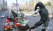 서울 송파구 관계자들이 22일 오전 송파구 올림픽로 중앙분리대에 있는 올림픽 상징 조형물 ‘원반던지기상’을 살수차로 닦아 내고 있다. 올림픽로 중앙분리대에는 각 운동 종목을 상징하는 조형물 수십 개가 세워져 있다. 박영대 기자 sannae@donga.com}