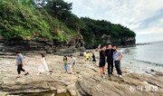 12일 전북 부안군 변산반도국립공원 채석강을 찾은 관광객들이 지질학의 교과서로 불리는 층암절벽을 배경으로 기념사진을 찍고 있다. 박영철 기자 skyblue@donga.com}