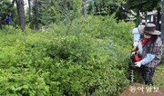 장맛비가 잠시 주춤해진 14일 광주 북구 우산근린공원에서 구청 공원녹지관리 직원들이 예초기로 장마철 무성해진 수풀 제거와 조경수 단장 작업을 하고 있다. 박영철 기자 skyblue@donga.com}