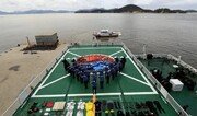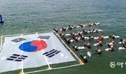 75주년 광복절을 나흘 앞둔 11일 전남 완도군 명사십리해수욕장 앞바다에서 완도해양경찰 구조대원과 민간 해양구조대원들이 순국선열을 기리기 위해 8.15km를 수영하기에 앞서 대형 태극기를 펼치고 파이팅을 외치고 있다. 완도=박영철 기자 skyblue@donga.com}