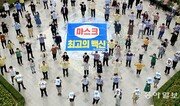 3일 광주시 북구청 광장에 모인 공무원들이 문인 북구청장과 함께 마스크 쓰기 캠페인을 펼치고 있다. 광주시는 이날부터 ‘사회적 거리 두기’를 2단계에서 1단계로 완화했다. 광주=박영철 기자 skyblue@donga.com}