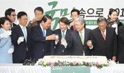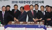 국민의당 안철수 대표(앞줄 왼쪽에서 네 번째)와 김동철 원내대표, 박주선 국회부의장 등 당 지도부가 1일 신년인사회에서 건배를 하고 있다. 통합 반대파인 호남 중진 의원과 동교동계 고문들은 대부분 불참했다. 김동주 기자 zoo@donga.com}