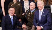 미국을 공식 방문 중인 문재인 대통령은 21일(현지시간) 6.25전쟁 참전용사 명예훈장 수여식에 참석했다.문 대통령은 이날 백악관 이스트룸에서 열린 6·25전쟁 참전용사 랄프 퍼켓 주니어(95) 예비역 대령의 명예훈장 수여식에 조 바이든 미국 대통령의 초청으로 참석했다. 미국 정부의 명예훈장 수여식에 외국정상이 참석한 것은 이번이 처음이다.‘메달 오브 아너’(Medal of Honor)로 불리는 명예훈장은 미군에게 수여되는 최고 무공훈장으로 미국 대통령이 백악관에서 직접 수여한다. 이번 수여식은 바이든 대통령이 취임한 이후 처음 열린 수여식이다.퍼켓 예비역 대령은 한국전과 베트남전 참전 당시의 공적을 인정받아 수훈십자상 2회, 은성 훈장 2회, 명예부상장 5회 등 다수의 훈장을 받았고, 1971년 퇴역했다. 그는 6·25전쟁 당시 청천강 북쪽의 전략적 요충지인 205고지를 방어하는 과정에서 생명을 무릅쓰고 중공군의 공격을 막아낸 공적을 인정받아 이번 명예훈장 수여 대상으로 선정됐다.문 대통령은 “바이든 대통령의 초청으로 퍼켓 대령의 명예훈장 수여식에 함께해 매우 뜻깊다”며 초대에 감사의 뜻을 전했다.또한 “퍼켓 대령님은 한국전쟁의 영웅”이라며 “대령과 미8군 레인저 중대 장병들을 비롯한 참전용사들의 희생으로 한국은 자유와 민주주의를 꽃피울 수 있었다”고 경의를 표했다.특히 “한국의 평화와 자유를 함께 지켜준 미국 참전용사들의 그 힘으로 한국은 폐허에서 다시 일어나 오늘의 번영을 이룰 수 있었다”며 “한국 국민들은 참전용사들을 통해 자유와 평화를 향해 전진하는 위대한 미국의 정신을 봤다. 참전용사들의 용기와 희생, 우정을 영원히 기억할 것”이라고 강조했다.바이든 대통령은 “문 대통령께서 이 자리에 함께 해주셔서 영광”이라며 "양국 간 동맹 관계는 이러한 용기와 단결, 헌신을 한국군과 미군이 함께 보이며 시작됐다. 양국이 함께 수십 년간 많은 것을 성취해 왔다”고 말했다.청와대 관계자는 한미 정상이 함께 수여식에 참석한 것에 대해 “68년간 이어져 온 한미동맹의 의미와 굳건함을 재확인하는 계기가 된 것”이라고 평가했다.김혜린 동아닷컴 기자 sinnala8@donga.com·워싱턴=공동취재단}