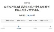 서울 노원구 세 모녀 살해 사건이 국민적 공분을 사고 있는 가운데 가해자 20대 남성의 신상을 공개하라는 요구가 빗발치고 있다.29일 청와대 국민청원에는 ‘노원 일가족 3명 살인사건의 가해자 20대 남성 신상 공개 촉구 바랍니다’라는 제목의 글이 올라왔다.청원인은 “하루에도 수십 명씩 죽어가는 여성들은 “안 만나줘”, “그냥(묻지마)”, “약하니까” 등 상대적 약자라는 이유로 많은 범죄에 노출되어 있다”며 “현재 노원 세 모녀 살인 사건으로 기사가 점점 올라오지만 세상은 왠지 조용한 것 같다. 조용하면 안 된다고 생각한다. 그냥 넘어가서도 안 된다”고 분노했다.이어 “현재 이 사건의 경우 가해자가 자해를 시도하여 치료 중이므로 아직 제대로 밝혀진 바는 없지만, 일가족 3명이 죽임을 당한 것은 확실한 사실이다. 작정을 하고 범행을 저지른 것 또한 확실한 사실”이라며 “가해자의 신상을 빠른 시일 내에 공개 바란다”고 촉구했다.해당 청원은 글이 올라온 지 하루 만에 약 15만 명의 동의를 얻었다. 20만 명의 동의를 얻으면 청와대의 공식 답변을 들을 수 있다.26일 서울 노원경찰서에 따르면 전날 오후 8시 30분경 노원구 중계동의 한 아파트에서 세 모녀가 숨진 채 발견됐다. 경찰은 당시 ‘친구와 연락이 안 된다’는 피해자 지인의 신고를 받고 출동해 아파트 안에서 숨져 있는 이들을 발견했다. 현장에 함께 있던 용의자 A 씨는 자해로 중상을 입어 병원으로 이송돼 수술을 받았다.경찰 조사에 따르면 A 씨는 큰딸과 온라인 게임에서 만난 사이로 만남을 거부당하자 앙심을 품고 범행을 저지른 것으로 전해졌다. 그는 23일 세 모녀의 아파트를 찾아 당시 집에 있던 작은딸과 귀가한 어머니를 잇달아 살해한 뒤 1시간 가량을 기다려 큰딸도 해친 것으로 밝혀졌다.이후 A 씨는 사건 현장에서 3일간 머물며 휴대전화를 초기화하는 등 증거 인멸 시도를 한 것으로 전해졌다. 경찰은 정확한 범행 동기 등을 조사하기 위해 A 씨의 휴대전화를 확보해 디지털 포렌식을 할 예정이다.김혜린 동아닷컴 기자 sinnala8@donga.com}