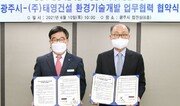 태영건설이 경기 광주시에서 하수처리 과정에서 나오는 찌꺼기를 활용한 바이오가스 생산에 나선다. 10일 태영건설에 따르면 이재규 태영건설 대표(사진 오른쪽)는 신동헌 경기 광주시장과 ‘한국형 통합 바이오가스 실증사업’을 위한 업무협약을 체결했다. 이는 환경부의 환경개발기술사업으로, 태영건설 컨소시엄은 경기 광주시 경안맑은물센터에 바이오가스 실증시설을 설치하고 운영하게 된다. 이 시설을 통해 하수처리 과정에서 나오는 찌꺼기 등 유기성 폐기물을 활용해 바이오가스를 생산한다. 경기 광주시는 이번 사업이 본격화되면 연간 10억 원 상당의 하수 찌꺼기 처리비용을 절감할 수 있을 것으로 예상된다. 태영건설 컨소시엄에는 엔텍스, 세트이엔지, 파이브텍 등이 참여하고 있다. 김호경 기자 kimhk@donga.com}