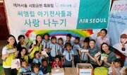 에어서울(대표 조규영)이 18일 캄보디아 씨엠립에서 첫 해외 봉사활동인 ‘씨엠립 아기천사들과 사랑 나누기’를 진행했다. 에어서울 캐빈승무원으로 구성된 사회공헌 ‘민트나래’는 씨엠립의 한 유치원에서 꿈과 희망을 전하는 그림 그리기, 가방 만들기 등의 미술 수업과 아이클레이를 이용한 놀이 활동을 가졌다.‘민트나래’는 재능기부 활동을 마치고 한국에서 준비한 간식과 학용품 등을 전달하기도 했다. 에어서울 관계자는 “에어서울 사회공헌팀인 ‘민트나래’는 자발적인 참여를 통해 시작했으며 앞으로도 다양한 부문에서 진정성 있는 사회공헌 활동을 이어갈 것”이라고 말했다.에어서울은 인천 ~ 씨엠립 노선을 수요일부터 토요일까지 주 4회 스케줄로 운항하고 있다.글: 전영한 기자 scoopjyh@donga.com 사진: 에어서울 제공}