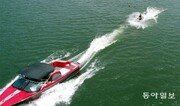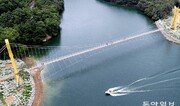 1일 전남 장성군 장성호 출렁다리 아래로 모터보트가 물살을 시원하게 가르며 달리고 있다. 박영철 기자 skyblue@donga.com}