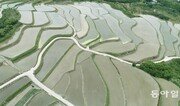 4일 지리산 자락에 있는 전남 구례군 산동면 사포마을의 다랑이를 드론으로 촬영한 모습. 다랑이는 산골짜기의 비탈진 곳 등에 있는 좁고 긴 계단식 논을 말한다.박영철 기자 skyblue@donga.com}