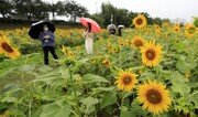 장마전선의 북상으로 전국적으로 장맛비가 내린 24일 광주시 서구 광천동의 광주천 고수부지에는 해바라기가 만개한 가운데 우산을 쓴 시민들이 걷고 있다.광주=박영철 기자 skyblue@donga.com}