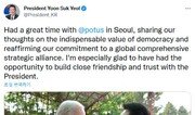 윤석열 대통령은 조 바이든 미국 대통령과의 회담 이후 “친밀한 우정과 신뢰를 쌓을 기회를 가진 데 대해 기쁘게 생각한다”고 밝혔다.23일 윤 대통령은 자신의 공식 영문 트위터에 글을 올려 이같이 말했다.윤 대통령은 “서울에서 바이든 대통령과 민주주의라는 필수 가치에 대한 생각을 공유하고 글로벌 포괄적 전략동맹에 대한 상호 간의 약속을 재확인하는 좋은 시간을 가졌다”고도 했다.윤 대통령은 바이든 대통령과 작별 인사를 하며 서로 악수하는 사진도 트위터에 공유했다.바이든 대통령은 지난 20일 방한해 2박 3일 일정을 소화했다. 첫날에는 경기 평택 삼성 반도체 공장을 방문했으며, 둘째 날에는 정상회담과 만찬 일정을 가졌다. 마지막 날에는 경기 오산 공군기지에 있는 항공우주작전본부(KAOC)를 방문했다.바이든 대통령은 윤 대통령과 작별의 악수를 하며 “당신을 신뢰합니다”(I trust you)라고 말하기도 했다.방한 일정을 마친 바이든 대통령은 22일 일본으로 출국했다. 양국 정상은 이날 오후 인도태평양 경제프레임워크(IPEF) 출범선언 정상회의에서 화상으로 재회할 예정이다.이혜원 동아닷컴 기자 hyewon@donga.com}