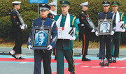 대한민국 임시정부 수립 100주년을 맞아 미국과 중국에서 독립운동에 헌신했던 강영각 김태연 이재수 지사의 유해를 국내로 모시는 유해봉영식이 9일 인천국제공항에서 열렸다. 맨 앞에 중국 상하이에서 임시의정원 서기로 활동한 김태연 지사의 영정과 유해가 든 상자가 보인다.인천=전영한 기자 scoopjyh@donga.com}