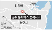 16일 오전 8시 20분경 경북 경주시 안강읍 대동리 대동과선교 다리에서 경주 안강여고 학생들이 탄 25인승 통학버스가 눈길에 미끄러져 넘어지는 사고가 발생했다. 이 사고로 2학년 장모 양(17)과 성모 양(17) 등 2명이 그 자리에서 숨지고 박모 양(15) 등 2명이 중상을 입었다. 운전사를 포함해 다른 여고생 11명도 부상을 입고 인근 병원에서 치료를 받고 있다. 경찰에 따르면 사고가 난 도로는 편도 2차로로 오른쪽으로 약간 굽어 있다. 경주시내에서 안강읍으로 들어가는 도로인데 평소 차량 통행이 적어 추운 날에는 노면이 얼어 있는 경우가 많다. 이번 사고는 눈길에 미끄러진 버스가 도로 오른쪽 콘크리트 벽에 2회 부딪친 후 중심을 잃으면서 진행하다 중앙 가드레일에 충돌해 오른쪽으로 굴렀다. 숨진 학생들은 안전띠를 매지 않아 버스 밖으로 튕겨 나오면서 변을 당했다.경주=장영훈 기자 jang@donga.com}