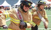 17일 오전 서울 양천구 목동종합운동장에서 열린 ‘2016년 종합소방기술경연대회’에서 소방호스 끌기 종목에 참가한 여성 의용소방대원들이 65m짜리 호스의 끝 부분을 어깨에 짊어지고 트랙을 달리고 있다. 의용소방대는 화재 진압 등을 보조하기 위해 자원봉사자 등으로 구성된 조직이다. 변영욱 기자 cut@donga.com}