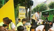 16일 서울 종로구 일민미술관 앞에서 bhc치킨이 자사의 사회공헌(CSR) 활동인 BSR를 홍보하고 있다. BSR는 bhc와 CSR의 합성어다. bhc치킨은 BSR 활동의 일환으로 치킨 한 마리가 판매될 때마다 일정 금액을 적립하는 ‘희망펀드’를 최근 조성했다박영대 기자 sannae@donga.com}