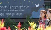4일 서울 종로구 광화문광장을 지나는 시민들 너머로 교보생명빌딩의 광화문 글판이 보인다. 광화문 글판은 계절마다 새로운 글귀로 옷을 바꿔 입는다. 올가을에는 신경림 시인의 ‘별’에서 따왔다. 박영대 기자 sannae@donga.com}