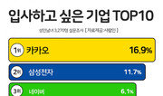 카카오와 네이버, 구글 등 IT기업들이 입사 선호도 조사에서 상위권을 차지했다. 공기업과 공공기관도 10위권 안에 대거 이름을 올리면서 연봉과 고용안정성 등이 보장된 기업이 높은 순위를 차지한 것으로 보인다.구인구직 매칭 플랫폼 사람인은 성인남녀 3270명을 대상으로 ‘입사하고 싶은 기업’ 선호 순위를 조사해 15일 발표했다. 그 결과, 카카오가 16.9%로 1위를 차지했다. 삼성전자(11.7%), 네이버(6.1%) 등이 뒤를 이었다. 다음으로 ▲한국전력공사(4.9%) ▲구글코리아(4.1%) ▲근로복지공단(3.9%) ▲국민건강보험공단(3.4%) ▲인천국제공항공사(3.3%) ▲현대자동차(3.3%) ▲한국관광공사(3%) 등의 순이다.연령별로는 20대(1002명)의 경우 카카오(20.9%), 삼성전자(13.4%), 네이버(8%)가 상위를 차지했다. 30대(1086명)는 카카오(20.5%), 삼성전자(11%), 네이버(6.8%) 등 순이다. 40대(713명) 선호도는 삼성전자(12.9%), 카카오(12.3%), 한국전력공사(5.9%) 순으로 나타났다.전체 응답자가 해당 기업을 선택한 이유로는 ‘회사 비전, 성장 가능성’(19.3%)이 가장 많았다. 이어 ‘정년보장 등 안정성’(17.7%), ‘높은 연봉’(16.1%), ‘사내복지 및 복리후생’(15%), ‘자기계발 등 커리어 향상 지원’(6.3%) 등이 있었다.선호하는 기업에 입사하기 위해서는 ‘인턴 등 직무경험’(36.8%, 복수응답)이 가장 중요하다고 생각하는 것으로 나타났다. 뒤이어 ‘자격증’(30.5%), ‘외국어 능력’(29.5%), ‘학력’(29.4%) 등을 중요하게 보고 있었다. 조혜선 동아닷컴 기자 hs87cho@donga.com}