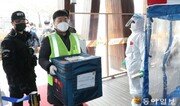 코로나 19 백신 접종을 하루 앞둔 25일 아스트라제네카 백신이 전국 보건소와 요양병원 등으로 옮겨졌다. 전날 경북 안동 SK 바이오사이언스 공장을 출발한 백신 15만 명분은 이천 물류센터에 도착해 이후 소분 작업을 거친 뒤 25일 0시 1분부터 제주도를 비롯해 전국 각지로 이송됐다. 서울 지역 대부분의 보건소에 이날 오전 백신이 도착했다. 백신을 실은 냉장 전용트럭 앞쪽으로는 경찰차가 배치됐고, 뒤편에서는 군사경찰이 호위했다. 전용용기에 담긴 백신은 보건소에 도착해서 군의 경호 속에 재빠르게 전달됐다. 백신은 보건소 담당자의 수량 확인을 거친 뒤 바로 전용 냉장고로 옮겨졌다. 이날 송파구청 보건소에는 5백 명분의 백신이 도착한 가운데 박성수 구청장이 현장을 방문해 접종준비 상황을 체크하고, 의료진을 격려했다. 한편, 아스트라제네카 백신은 26일 오전 9시 전국 보건소와 요양병원 등에서 환자와 의료진에게 접종 될 예정이다.김재명 기자 base@donga.com}