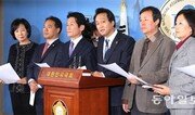 국회 ‘최순실 국정농단 의혹사건 진상규명을 위한 국정조사특별위원회’ 야당 의원들이 28일 국회에서 긴급 기자회견을 열고 있다. 이 의원들은 “새누리당이 청문회 증인 채택에 시종일관 비협조적인 태도를 보이고 있다”며 삼성, 국민연금공단 관련 증인 채택과 김수남 검찰총장의 청문회 출석을 촉구했다. 홍진환 기자 jean@donga.com}