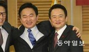 새누리당을 탈당해 개혁보수신당(가칭)에 합류한 원희룡 제주도지사(가운데)가 4일 서울 여의도 국회 의원회관에서 열린 개혁보수신당 창당추진위원회에 참석해 정병국 위원장(왼쪽), 남경필 경기도지사와 어깨동무를 하고 있다. 홍진환 기자 jean@donga.com}