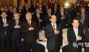 6일 서울 여의도 CCMM빌딩에서 열린 ‘대한민국헌정회 신년하례회’에서 정세균 국회의장 등이 국민의례를 하고 있다. 앞줄 오른쪽부터 더불어민주당 추미애 대표, 정 의장, 신경식 헌정회장. 홍진환 기자 jean@donga.com}