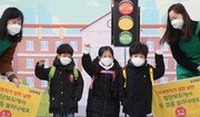 유한킴벌리는 6일 서울 청계광장에서 마스크를 쓴 어린이 모델들과 함께 미세먼지 농도가 높은 날 호흡기 건강을 지키는 요령을 소개했다. 캠페인용 깃발에 ‘미세먼지가 심한 날엔 횡단보도에서 두 걸음 물러나세요’라는 안내 문구가 보인다. 홍진환 기자 jean@donga.com}