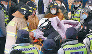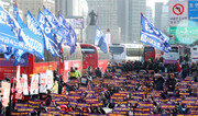 전국민주노동조합총연맹 산하 전국금속노동조합(금속노조)가 24일 오후 2시 서울 종로구 세종로공원 앞에서 ‘2018년 신년 투쟁 선포식’을 열었다. 이날 집회에는 금속노조 조합원 약 5000명이 참가했다. 이들은 세종로공원 앞에서 집회를 마친 뒤 오후 3시 10분경 청와대 앞을 향해 행진했다. 오후 3시 반경 청와대 앞에 도착한 참가자들은 “(복수노조 교섭) 창구 단일화 정책 폐기” “산별교섭 제도화” 등의 구호를 외쳤다. 이어 오후 4시경 자진 해산했다. 평일 낮에 열린 집회로 도로가 통제되면서 일부 구간에서 정체가 빚어졌다. 또 세종대로 3개 차로와 경복궁 서쪽 4개 차로에서 행진이 열리고 참가자들이 타고 온 전세버스가 바깥 차로에 주차하면서 버스 이용객들이 불편을 겪었다. 그러나 올 겨울 가장 추운 날씨 탓에 집회 참가자는 주최 측 예고보다 1000명가량 적었다. 경영 정상화를 두고 회사와 갈등을 겪고 있는 금호타이어 노조원이 2500여 명으로 가장 많았다. 권기범 기자 kaki@donga.com}
