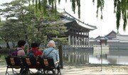 17일 서울 종로구 경복궁을 찾은 관람객들이 단청 무늬로 장식된 의자에 앉아 경회루를 감상하고 있다. ‘2022 봄 궁중문화축전’ 행사는 22일까지 진행되는데 경회루, 향원정 앞 의자에 앉아 휴식을 취하는 ‘명상: 궁을 보다’ 등 다양한 문화예술 프로그램이 예정돼 있다. 신원건 기자 laputa@donga.com}