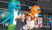 11일 오전 부산 해운대구 벡스코 제1전시장 앞 광장에서 광주시와 광주세계수영선수권대회 조직위원회가 ‘2019 광주세계수영선수권대회’를 홍보하기 위해 만든 대회 마스코트인 수리와 달이 조형물 앞에서 시민들이 기념촬영을 하고 있다. 대회는 다음 달 12일부터 28일까지 광주에서 열린다.박경모 기자 momo@donga.com}