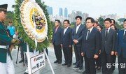 자유한국당 황교안 대표(앞줄)가 18일 부산 남구 유엔기념공원에서 전몰장병 묘역을 참배하고 있다. 부산=박경모 기자 momo@donga.com}