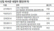 이명박 대통령은 23일 신설된 대통령서민정책비서관에 박병옥 경희대 NGO(비정부기구)대학원 강사, 해외홍보비서관에 손지애 주요 20개국(G20)정상회의 준비위원회 공동대변인을 내정하는 등 남은 비서관 인선을 마무리했다. 다만 손 내정자는 11월 G20 정상회의가 끝나기 전까지는 파견 형식으로 G20 업무에만 주력할 예정이다. 이로써 대통령비서관 46명 가운데 20명이 교체됐고 25명이 유임됐으며 총무비서관은 공석으로 남게 됐다. 기획관급 중에선 인사기획관 정책기획관이 공석이다. 김희정 청와대 대변인은 “이동우 전 메시지기획비서관이 정책기획관 직무를 대리할 것”이라고 말했다.정용관 기자 yongari@donga.com}