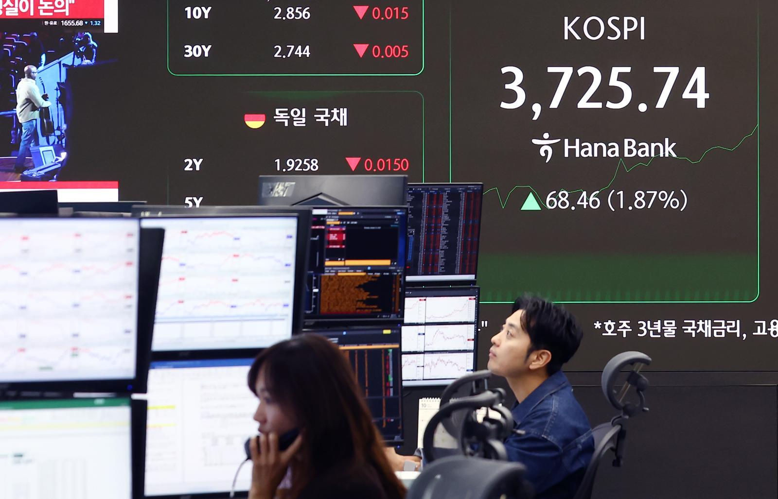 코스피가 사상 처음으로 3,700 선을 돌파했다. ‘대장주’인 삼성전자 주가가 ‘반도체 슈퍼사이클’에 대한 기대감으로 사상 최고점을 갈아 치운 데다, 한미 관세 협상 타결 기대감으로 현대자동차와 기아 등 자동차 종목이 급등한 영향으로 풀이된다. ‘코스피 4,000 돌파’에 대한 기대감도 고조되고 있다.● ‘반도체 투톱’ 사상 최고가16일 코스피는 전 거래일 대비 2.49% 상승한 3,748.37로 장을 마치며 사상 처음으로 3,700 고지에 올랐다. 이날 장중에는 3,738.34를 찍어 장중 최고점도 다시 썼다. 코스피는 9월 10일 3,300 선을 돌파해 4년 2개월 만에 최고점을 넘긴 뒤 3거래일 만인 9월 15일 3,400을, 그 후 13거래일 만인 이달 2일 3,500을 넘겼다. 다시 1거래일 만에 3,600의 벽을 허물더니, 4거래일 만인 이날 3,700도 넘어섰다. 코스피는 9월부터 17% 넘게 성장했다.상승을 주도한 것은 삼성전자였다. 9월 1일 ‘6만 전자’(6만7600원)에 머물렀던 삼성전자의 주가는 10월 10일 4년 9개월 만에 ‘9만 전자’(9만4400원)에 복귀했다. 삼성전자의 3분기(7∼9월) 영업이익이 증권가 전망치(10조∼11조 원 수준)를 1조 원 이상 웃돌았기 때문이다. 16일엔 주당 9만7700원으로 최고가를 경신했다. 삼성전자와 함께 ‘반도체 투톱’인 SK하이닉스도 전 거래일 대비 7.1% 오른 45만2500원으로 신고가를 다시 썼다. 한미 관세 협상이 마무리될 것이란 기대감도 한몫했다. 고율 관세 우려에 짓눌렸던 현대차는 전 거래일 대비 8.28%, 기아는 7.23% 상승했다. 테슬라의 중국 생산량 증가 소식에 LG에너지솔루션은 8.8%, SK이노베이션은 7.71% 오르는 등 2차전지 관련주들이 급등했다. 부동산에서 증시로의 ‘머니 무브’ 조짐이 보인다는 해석도 나온다. 증권업계 관계자는 “부동산 대책이 투자 심리를 증시로 유도하는 효과가 있었을 것”이라고 말했다.● 6.7%만 오르면 코스피 4,000 달성 코스피 4,000에 대한 기대감도 커졌다. 6.7%만 더 오르면 달성이 가능하다. 글로벌 투자은행(IB)인 모건스탠리는 최근 코스피 목표 주가를 기존 3,250에서 3,800으로 상향했다. 약세장이 나타나면 3,100까지 내릴 수 있지만 강세장이 이어지면 최대 4,200까지 오를 수 있다고 봤다. JP모건은 코스피가 향후 12개월 안에 4,000∼5,000대에서 움직일 것이란 의견을 냈다. 백찬규 NH투자증권 연구원은 “코스피 4,000 달성은 올해 되느냐, 내년에 되느냐의 문제일 수 있다”며 “한미 관세 협상이 끝나지 않았다는 것이 변수”라고 말했다. 정용택 IBK투자증권 연구원은 “올해 경제성장률이 1% 이하 수준인 점과 소비쿠폰 효과 뒤에 내수를 어떻게 극복할지가 관건”이라고 말했다.한재희 기자 hee@donga.com}