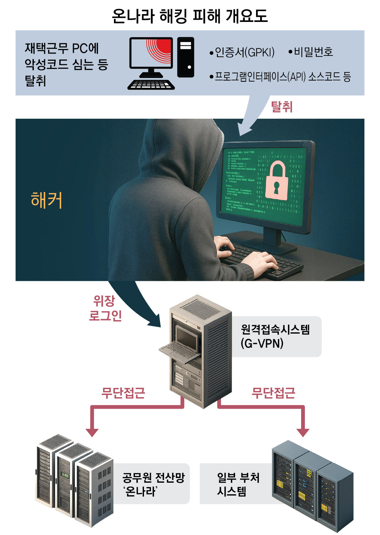 정부 전산망에 접속할 수 있는 ‘열쇠’인 행정전자서명(GPKI)이 해커에게 탈취되고, 실제 접속까지 허용된 사실이 드러났다. 공공기관의 내부 자료로 접근할 수 있는 핵심 인프라가 뚫린 건 이번이 처음이지만, 정부는 어떤 자료가 유출됐는지도 정확히 확인하지 못하고 있다. 최초 공격 시점으로부터 3년 가까이 침투를 알아채지 못했다는 점에서 ‘전자정부’의 보안 체계가 뿌리부터 흔들렸다는 지적이 나온다. 행정안전부와 국가정보원은 17일 “신원이 확인되지 않은 해킹그룹이 공무원 약 650명의 GPKI 인증서와 12명의 비밀번호를 탈취했고, 일부는 이를 이용해 정부 전산망인 ‘온나라’ 시스템에 접속해 자료를 열람한 것으로 확인됐다”고 밝혔다. 온나라는 중앙부처와 지방자치단체가 사용하는 전자결재·업무관리 시스템으로, 외부에 공개되지 않는 정책 초안과 인사 및 조직 관련 자료가 저장돼 있어 행정 업무의 ‘심장부’로 불린다. 최초 공격은 2022년 9월이었지만 국정원은 올해 7월에야 해킹 정황을 인지하고 악용된 인터넷주소(IP주소)를 차단하는 등 긴급 조치를 취했다. 미국의 비영리단체 ‘디도시크리츠’는 이번 해킹의 배후로 북한 정찰정보총국 산하 조직 ‘김수키’를 지목했다. 하지만 국정원은 중국발 가능성도 배제하지 않고 있다. 국정원 관계자는 “해커가 한국어를 중국어로 번역한 기록과 대만 정부망 해킹 시도 정황이 확인됐다”며 “모든 가능성을 열어두고 배후를 추적 중”이라고 밝혔다. 행안부는 재택근무용 개인 PC가 악성코드에 감염돼 GPKI가 유출된 것으로 보고 있다. 정부는 재발 방지를 위해 모바일 공무원증 등 생체 기반 복합 인증체계로 전환할 방침이다.임재혁 기자 heok@donga.com신나리 기자 journari@donga.com}