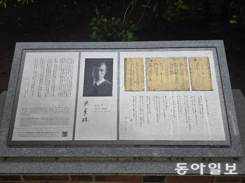 11일 오후 일본 도쿄의 릿교대 교정. 시인 윤동주(1917~1945)의 기념비가 타치가와(太刀川)기념관 인근의 작은 보행로 옆에 새로 세워졌다. 도쿄에 시인의 기념비가 들어서는 것은 처음이다. 윤동주는 연희전문학교(현 연세대)를 졸업한 뒤 1942년 4월부터 반년간 릿쿄대에서 공부했고 이후 교토 도시샤대에 편입했다. 앞서 연세대와 도시샤대에는 윤동주를 기리는 기념물이 있었지만, 릿교대에는 없었는데 그의 80주기를 맞은 올해 기념비가 들어선 것이다. 이날 궂은 비가 내리는 가운데 시인이 다녔던 연세대, 릿교대, 도시샤대의 관계자 등 100여 명이 기념비 제막식에 참가했다. 니시하라 렌타(西原廉太) 릿쿄대 총장은 “80년의 세월을 거쳐 윤동주 시인이 릿쿄대에 돌아왔다”고 했다. 기념비 설치 장소에 대해서는 “윤동주가 재학 시절 사제들과 교류가 있었던 것으로 알려졌는데, 사제들의 집이 비석 인근에 있었다고 한다. 아마 이 앞길을 윤동주가 평소 자주 걸었을 것”이라고 했다. 윤동주의 조카인 윤인석 성균관대 명예교수는 “교토에는 윤동주 시비가 있고, 옥사한 후쿠오카에서는 윤동주 시를 읽는 모임이 지속되고 있다”면서 “릿쿄대 기념비 설립을 계기로 시인 윤동주가 머물던 곳에는 모두 기념물이 설치된 것 같다”며 반겼다. 기념비에는 그가 릿교대 재학시절인 1942년 6월 3일 한글로 쓴 ‘쉽게 씌어진 시’와 일본어 번역본, 윤동주 사진, 릿교대 생황을 설명한 짧은 글이 적혀있다. 윤동주는 릿쿄대 재학 중에 백합 문양이 인쇄된 릿쿄대 편지지에 ‘쉽게 씌어진 시’, ‘흰 그림자’ 등 주옥 같은 서정시 5편을 남겼다. 원본은 연세대 윤동주기념관에 보존돼 있다. 윤동주는 도시샤대에 다니던 중인 1943년 조선 독립을 논의하는 유학생 단체 활동을 했다는 혐의로 일본 경찰에 체포됐다. 후쿠오카 형무소에서 해방을 앞둔 1945년 2월 16일 옥사했다. 그가 스물여덟 때였다. 올해는 광복 80주년, 한일 국교정상화 60년을 맞은 해다. 윤동섭 연세대 총장, 니시하라 릿쿄대 총장, 고하라 가쓰히로(小原克博) 도시샤대 총장은 앞으로 앞으로 서로 협력해 윤동주를 기리는데 합의했고, 유족도 적극 돕기로 했다. 이혁 주일 한국대사는 “이 기념비가 윤동주의 문학과 생애를 기리는 존재를 넘어 한일 양국의 화해, 협력으로 이어지는 가교가 되기를 희망한다”고 했다. 도쿄=황인찬 특파원 hic@donga.com}