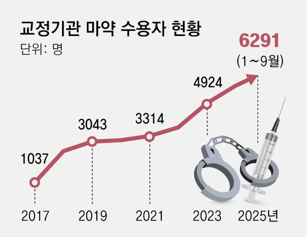 “아빠!” 선고를 앞둔 조용한 법정에 세 살배기 아이가 피고인을 부르는 목소리가 울려 퍼졌다. 광주지법 형사1단독 김호석 부장판사는 방청석에 있던 아이의 목소리를 듣고 “아이고”라며 짧게 탄식했다. 이날 30대 서모 씨는 올해 1월부터 6월까지 소셜네트워크서비스(SNS)를 통해 필로폰을 13차례에 걸쳐 사거나 투약을 시도한 혐의로 피고인석에 섰다. 김 부장판사는 서 씨가 장기간 필로폰을 매수, 투약해 죄질이 가볍지 않다며 징역 1년 6개월을 선고했다.● 교정시설 내 마약사범, 8년 새 6배로 급증26일 국회 법제사법위원회 소속 추미애 더불어민주당 의원이 법무부로부터 제출받은 ‘교정기관별 마약 수용자 현황’ 자료에 따르면 서 씨처럼 전국 교정기관에 수용된 마약류 사범은 2017년 1037명에서 지난해 5779명으로 꾸준히 늘었다. 올해 9월 기준으로는 6291명으로, 8년 만에 6배 이상으로 증가하며 역대 최대치를 기록했다. 상황이 이렇다 보니 전국의 교정시설은 포화 상태다. 8월 기준 전국 교정시설의 평균 수용률은 128.5%로, 특히 부산구치소는 158.1%에 달했다. 55개 교정시설 중 수감 인원이 정원에 미달한 곳은 5곳뿐이었다. 부산구치소는 과밀 문제가 심각해지자 지난해 말 수사기관과 법원에 “구속영장 청구를 숙고하고 보석 등 석방 요청에 적극적으로 협조해 달라”는 공문을 보내기도 했다. 다른 구치소의 일부 수용자는 정부를 상대로 “5평(약 16.5m²)도 안 되는 방에서 10명 이상 생활한다. 과밀 수용은 인권 침해”라며 소송을 낸 것으로 알려졌다. 교정기관에 수용된 마약사범 급증의 배경으로는 소셜미디어를 중심으로 한 마약 유통망 확산과 온라인 거래의 손쉬운 접근성 등이 꼽힌다. 해외 밀반입량이 급격히 늘면서 국내 공급이 폭증한 점도 한몫했다. 실제로 검찰과 경찰은 최근 대규모 밀수·유통 조직을 잇달아 적발하고 있다.지난달 30일 경기 수원지검은 약 11만 명이 동시에 투약할 수 있는 양의 마약을 밀수입·유통하려 한 내·외국인 8명을 구속 기소했다. 이들 중 40대 한국인은 경기 수원 성남 의왕 고양, 인천 일대에 필로폰 2.2kg을 숨겨놓았다가 적발됐다. 또 전남경찰청은 올해 6월 무등록 대포차를 이용해 전국을 돌며 필로폰 등을 유통·판매한 30대 태국인 총책을 포함해 총 32명을 무더기 구속해 검찰에 송치했다.● “처벌만으론 한계… 재활·치료 병행해야” 교정기관에 갇힌 마약사범이 급증하는 반면 재활을 전담해 이들의 치료와 마약 근절을 담당하는 부서와 인력은 전무한 것으로 확인됐다. 중독성이 강해 재범률이 높은 마약 범죄의 특성상 재활은 사회의 일원으로 돌아오기 위한 필수 과정임에도 마약사범들에 대한 사후 관리가 미흡하다는 지적이 나온다. 법무부의 ‘교도소별 마약사범 전담 부서(인력 포함) 및 중독·재활 프로그램 현황’에 따르면 교정 당국은 “법무부 교정본부에서는 마약사범재활팀을 신설해 중독·재활 프로그램 개발과 집행 등 정책을 마련하고 있다. 하지만 이를 실행할 교정기관의 전담 부서 및 인력이 없어 부서 신설과 인력 충원이 필요한 상황”이라고 답했다. 다만 부산, 경기 화성 등 교도소 5곳에서는 재활 의지가 높은 마약류 사범을 대상으로 맞춤형 마약 회복 프로그램인 ‘회복이음과정’이 진행 중이다. 전문가들은 처벌받는 마약사범은 늘어나고 있지만 이들에 대한 재활이나 치료 등은 부족한 상황을 두고 “단순 처벌이 아닌 재활과 치료가 병행되어야만 ‘마약 청정국’으로의 회복이 가능하다”고 강조한다. 박영덕 인천참사랑병원 마약상담실장은 “일부 교도소에서 진행하고 있는 회복 프로그램을 수강하기 위해 다른 교도소에서까지 줄을 서서 대기할 만큼 담당 인력과 예산이 부족한 상황”이라며 “마약은 어떤 범죄보다도 재범률이 높은 만큼 국가적인 차원에서 예산과 인력, 인프라 등을 지원해 재활 치료 전담 부서를 만들고 재범률을 줄이는 것이 필요하다”고 말했다.최미송 기자 cms@donga.com광주=이형주 기자 peneye09@donga.com}