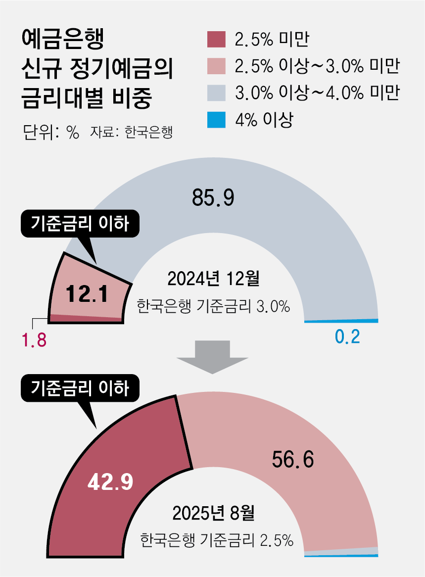 은행들이 최근 내놓은 신규 정기예금 10개 중 4개는 기준금리에 못 미치는 이자율을 적용하고 있는 것으로 나타났다. 이재명 대통령의 ‘이자 장사’ 비판에도 기준금리 인하기에 은행권은 예금금리는 빨리, 대출금리는 천천히 낮춰 예대금리 격차가 1%포인트 넘게 벌어진 것으로 조사됐다. 8일 한국은행의 ‘금융기관 가중 평균 금리’ 통계에 따르면 8월 예금은행이 새로 취급한 정기예금 가운데 42.9%는 기준금리(2.5%)를 하회하는 것으로 집계됐다. 세부적으로는 △2.0% 이상∼2.5% 미만이 40.5% △1.5% 이상∼2.0% 미만이 2.3% △1.0% 이상∼1.5% 미만이 0.1%이다. 정기예금 비중이 가장 큰 구간은 2.5% 이상∼3.0% 미만(56.6%)이었다. 반면 기준금리가 3.0%였던 작년 12월에는 대부분(85.9%)이 기준금리를 상회하는 3.0% 이상∼4.0% 미만의 금리였다. 당시 정기예금 금리가 기준금리를 밑돈 비중은 13.9%였다. 정기예금 금리가 기준금리에 못 미친 비중이 8개월 만에 3배로 불어난 셈이다. 한편 가계대출 금리는 8월 현재 3.5% 이상∼4.0% 미만(47.1%)이 가장 큰 비중을 차지했다. 지난해 12월에는 4.0% 이상∼4.5% 미만(41.9%)의 비중이 가장 컸다. 대출금리는 자금조달금리(금융채 등), 대출기준금리(코픽스 등), 가산금리(리스크·유동성·신용 프리미엄, 자본비용 등)로 구성된다. 기준금리 인하에 따라 대출금리도 하향 조정됐지만 가계대출과 예금금리 간 격차(예대금리차)는 더 벌어졌다. 5대 시중은행의 8월 신규 취급액 기준 예대금리 차는 평균 1.572%포인트였다. 지난해 8월(0.314%포인트) 대비 1%포인트 넘게 뛰었다. 이 대통령이 올해 7월 24일 수석보좌관회의에서 은행권을 향해 “손쉬운 주택담보대출 같은 이자 놀이, 이자 수익에 매달릴 게 아니라 투자 확대에도 신경 써주길 바란다”고 말한 뒤에도 예대금리 차가 더 벌어진 것이다. 은행권은 기준금리가 내려가면 대체로 시중금리가 하락하지만 시장 기대나 자금 사정에 따라 금리 하락의 시차가 발생할 수 있다고 설명한다. 특히 금융 당국의 ‘가계대출 총량제’ 탓에 대출금리를 예금금리만큼 빠르게 내릴 수 없다는 얘기다. 은행 관계자는 “시장금리는 금융시장에서의 자금 수급, 경기 및 물가 전망, 은행의 유동성 상황 등을 종합적으로 고려해 결정된다”면서 “예금금리가 낮아진 현 상황은 미국 연방준비제도의 금리 인하 기대 등이 반영된 영향”이라고 설명했다. 또 다른 관계자는 “대출 총량제 등으로 은행들의 자금 수요가 낮아지는데 예금이 늘면 비용이 늘기 때문에 은행들은 예금 규모를 조정하기 위해 금리를 낮추게 된 것으로 보인다”고 말했다. 전문가들은 은행권이 ‘이자 장사’ 비판을 받지 않으려면 대출금리 인하 속도에 맞게 예금금리 속도 조정이 필요하다고 지적한다. 김대종 세종대 경영학부 교수는 “정부의 대출 규제에 은행들은 ‘잘됐다’며 대출금리는 서서히 낮추는 모양새”라면서 “예금금리가 낮아 부동산 투기 등으로 자금이 몰리는 경향이 나타난다”고 말했다.신무경 기자 yes@donga.com}