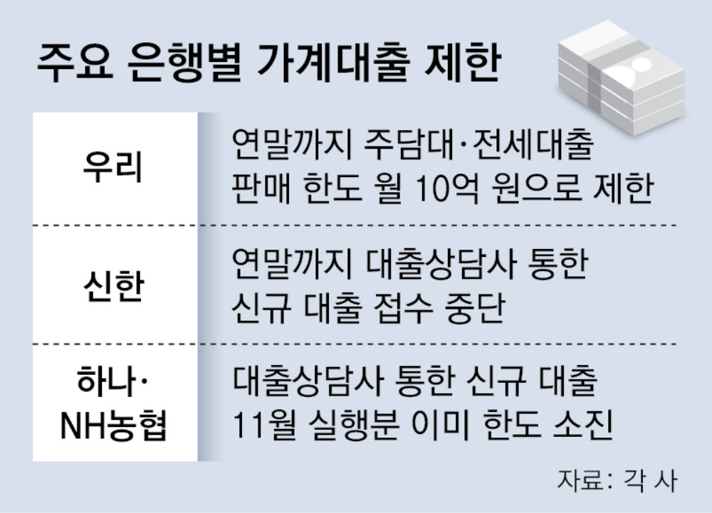 10·15 부동산 대책으로 주택담보 대출 한도가 가격에 따라 2억 원까지 줄어든 가운데 시중은행들도 점포당 주택담보대출 월 한도를 10억 원으로 묶는 등 대출 문턱을 높이고 있다. 대출모집인을 통한 가계대출 신청을 막는 은행도 생겨나 연말까지 대출받기가 더 까다로워질 것으로 전망된다.19일 은행권에 따르면 우리은행은 올해 11월과 12월 영업점별 부동산금융상품(주택담보대출, 전세자금대출 등) 판매 한도를 월 10억 원으로 제한한다고 지난주 공지했다. 영업점 한 곳에서 11월과 12월에 월별로 주담대 상품 등은 10억 원까지만 판매할 수 있다는 얘기다. 통상 대출 두세 건이 집행되면 월별 한도가 다 차 사실상 현장에서 대출받기가 어렵게 됐다.우리은행은 입주자금 대출(정책성 대출 제외) 한도도 조인다. 신규 사업장에 대해 대출을 선별적으로 취급하거나 규모를 줄인다. 다만 대출상담사를 통한 대출은 모집 법인별 월별 한도를 관리하며 신규 대출을 신청받고 있다. 비대면 대출도 접수받고 있다.다른 은행들은 대출모집인을 통한 대출 접수를 제한하고 있다. 신한은행은 대출상담사를 통한 신규 대출 접수를 연말 실행분까지 중단했다. NH농협은행은 대출모집인을 통한 주담대·전세대출 한도를 매월 관리 중인데 11월 실행분의 한도는 소진됐다. 12월분은 한도를 검토 중이라 대출을 신청받지 않고 있다. 하나은행도 대출 모집법인을 통한 11월 실행분 가계대출 접수를 마감했다. 현재 12월 이후 실행분만 신청받고 있다.은행들이 대출을 옥죄는 이유는 지난달 기준 연간 가계대출 증가 목표치를 이미 넘어섰거나 목표치에 근접했기 때문이다. 10월 들어 가계대출 증가 추세가 반등한 영향도 있다. 5대 은행(KB국민·신한·하나·우리·농협)의 16일 기준 가계대출 잔액은 765조6483억 원으로, 9월 말(764조949억 원) 대비 1조5534억 원 늘었다. 가계대출 중 주담대(전세대출 포함) 잔액은 609조6945억 원으로, 9월 말(608조9848억 원)에 비해 7097억 원 늘었다. 한편 세 차례 이어진 부동산 대책 여파는 저축은행, 상호금융 등 2금융권에서 돈을 빌리는 서민들에게 영향을 미치고 있는 것으로 보인다. 19일 국민의힘 김상훈 의원실이 금융감독원에서 제출받은 자료에 따르면 6·27 대출 규제 시행 이후 약 두 달간 저축은행에 접수된 개인 자동차 담보대출 신청은 총 24만8000건으로 집계됐다. 영업일 기준 하루 평균 5636건으로, 대출 규제 전인 올해 1∼5월 하루평균 신청 건수(2230건)보다 약 150% 늘었다. 저축은행 차담대는 신용점수만으로는 돈을 충분히 빌리기 어려워 차를 담보로 한도를 늘리려는 사람들이 이용하는 경우가 많다. 이와 달리 개인신용대출 하루 평균 취급 건수는 저축은행이 4930건에서 3614건으로 약 27% 줄었고, 상호금융도 500건에서 409건으로 약 18% 감소했다.신무경 기자 yes@donga.com}