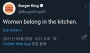 버거킹이 8일(현지시각) ‘세계 여성의날’을 맞아 ‘여성은 부엌이 제격이다(Women belong in the kitchen)’라는 문구를 공식 SNS 계정에 게재했다가 역풍을 맞았다.미 NBC뉴스 등에 따르면 버거킹 영국법인은 이날 트위터 계정에 이같은 문구를 게재했다. 같은날, 뉴욕타임스(NYT) 지면에도 똑같은 문구가 전면 광고로 실렸다.논란은 거셌다. 대다수의 누리꾼은 “성차별을 이용해 홍보에 나선 것이냐”, “여성의날에 이게 무슨 말이냐”, “20여년을 이용한 버거킹에게 상당히 실망했다”, “관심 받으려고 올린 것이냐” 등 비난이 이어졌다.이에 버거킹 측은 반나절 만에 “첫 트윗이 잘못됐음을 인정하고 사과한다”면서 “영국의 요식업계 요리사 중 20%만이 여성이라는 사실을 알리고 싶었을 뿐”이라고 해명했다.그러면서 “우리는 요식업계에서 여성 종업원들을 더 많이 고용해 그들이 요식업 경력을 쌓도록 돕고자 여성을 위한 새로운 장학금 프로그램을 시작했다”고 알렸다. 아울러 문제가 된 첫 트윗은 삭제했다.조혜선 동아닷컴 기자 hs87cho@donga.com}